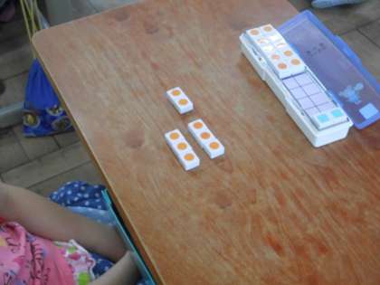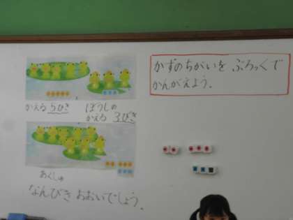 算数の学習で,「どちらがどれだけ多いか。」を数図ブロックを使って考えます。挿し絵に描かれて個数を数図ブロックに置き換えて,操作しながら答えを求めていきます。先生と一つ一つ問題を確かめながら学習を進めていきました。