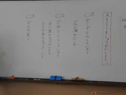 国語では「スイミー」のお話を読み進めています。今日は「スイミーを紹介しよう。」ということで,自分が考えるスイミーを友だちと紹介し合い,交流しました。