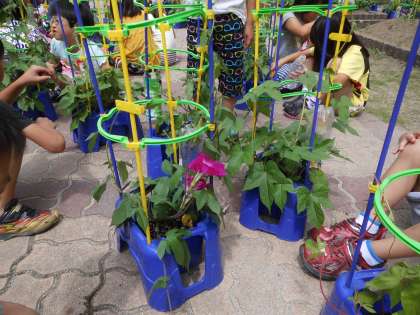 生活科でアサガオの観察です。きれいな花を咲かせている人もいます。つぼみもいくつあるのか教えてくれました。ツルが自分たちの背と同じぐらいにまで伸びていることにも気がついていました。