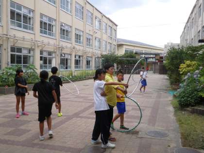 管理用務員さんからダブルダッチを教えてもらい,みんなできるようになって楽しんでいますが,今日はフラフープを使って遊んでいました。フラフープを腕を使ってまわしていくのですが,少しまわし方に特徴があるようで,みんな真剣な表情で取り組んでいました。放課後もみんな,遊びに夢中です。