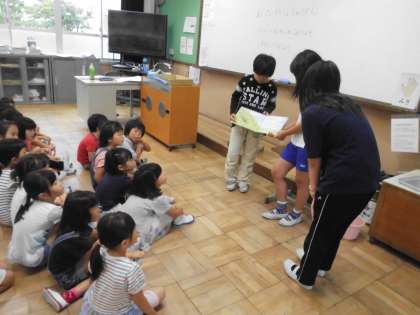 今日は図書委員会のメンバーが1・2年生の教室で,絵本の読み聞かせをしてくれました。5・6年生のお兄さん,お姉さんたちの読み聞かせに,みんな聞き入っていました。