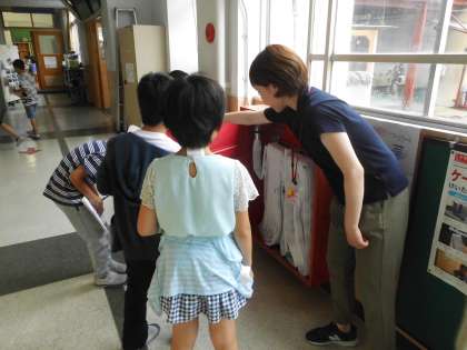 社会の「火事をふせぐ」の学習で,学校の防火設備,消火設備を調べてまわりました。担任の先生が消火栓の扉を開けて,中を特別に見せてもらいました。普段は目にできないので,みんな興味津々。いい学習ができています。