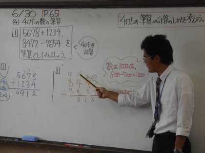 算数で3けたのたし算とひき算の筆算の学習をしてきましたが,今日は4けたの筆算の挑戦です。でも,これまで学習してきたことと同じことを繰り返していけば解けることがわかりました。