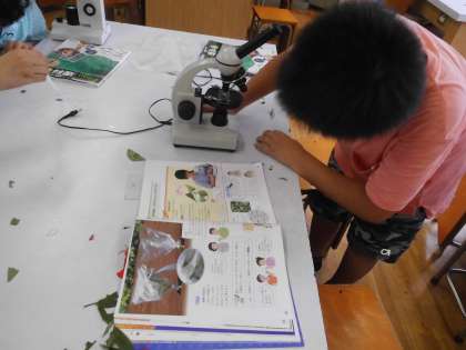 理科で顕微鏡の使い方を学習しています。葉の気孔を探し出します。プレパラートの位置やピントの調節など,苦労しながらもみんな頑張って顕微鏡を操作していました。