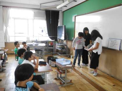 5・6年生の図書委員による読み聞かせは,3・4年生に向けて行ってくれました。先輩のお兄さん,お姉さんの読み聞かせを前に出てきて聞き入っていました。