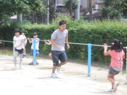 梅雨の晴れ間,運動場で元気に遊ぶことができました。大変蒸し暑い中でしたが,先生も一緒になって走っています。子どもたちも,そして先生たちも暑さに負けずみんな元気です。