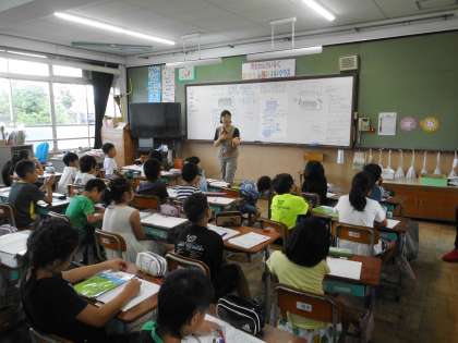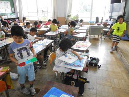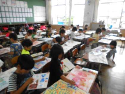 図工の時間では絵の具を使って絵を描いていきます。絵の具を上手に混ぜ合わせ,自分がイメージする色を作り出してから,ていねいにぬっていきました。