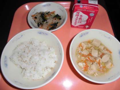 麦ごはん・牛乳・高野どうふのそぼろ煮・小松菜と切干大根の煮びたし