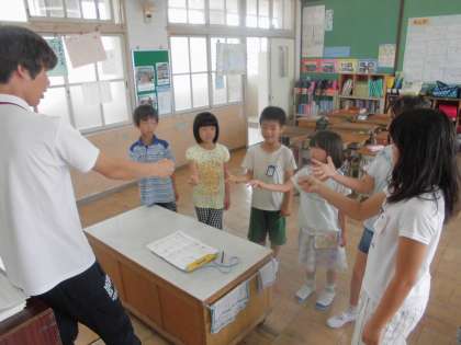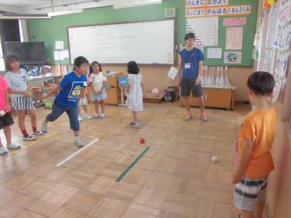 「先生とじゃんけん」「わなげに挑戦しよう」「玉入れにちょうせんしよう」 みんなも,そして先生も一緒になって盛り上がっています。
