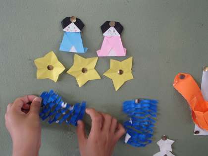 今日は七夕。女の子が織姫と彦星と天の川の折り紙を作ってくれました。教室の壁にかざってあります。今夜は二人は会えるでしょうか。子どもたちの夢の中で会っているかもしれませんね。