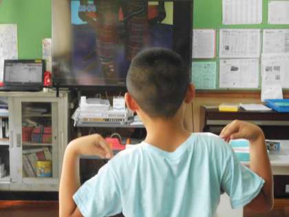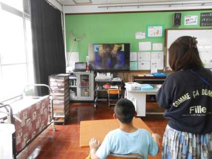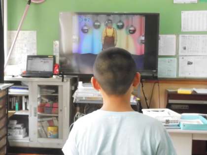 外国語活動の時間の様子です。テレビが流れてくる映像と音声に合わせて自分も動きます。「stand up!」「sit down!」なかなかにいい反応です。