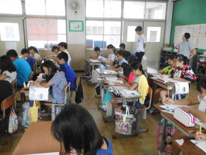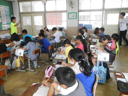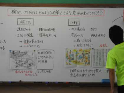 社会の歴史学習。豊臣秀吉が行った政策の一つ「検地・刀狩」について今日は学習しました。天下統一に向けてどのような政策がとられたのか,織田信長・徳川家康とのつながりも考えながら学習しています。