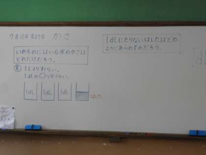 算数「かさ」の学習ですが,今日はまた新しい単位「dl(デシリットル)」「mL(ミリリットル)を学習しました。前回学習した「l(リットル)」はよく目にしますが,「dl」はあまり見かけません。どれぐらいの量をあらわすのか,容器を使って確認ですね。