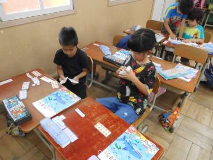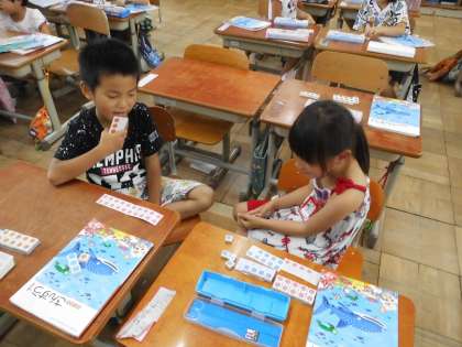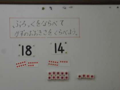1年生は,数の大きさを数図ブロックを使って調べます。友だちと出し合った数字で,どちらが大きな数字かも確かめながら,学習を進めていきました。