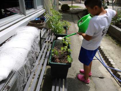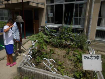 今日も大変暑い一日になりました。作物への水やりは欠かせません。肥料とともにたっぷりと水をあげてやり,大きく育つようにと日々,見守っています。