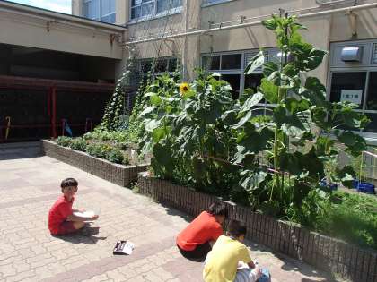 中庭でいつの間にか,背丈よりも遥かに大きくなった向日葵をスケッチしています。炎天下の中でもボードを片手に懸命に観察する姿が,満開のひまわりのように素敵です。