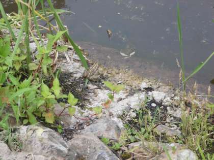 ちびっこ広場には低学年を中心に生き物好きが集まってきます。今日は大きなかえるを見つけて大喜び。そして,草むらの中にいるかえるも見つけます(下の写真)。みんないい目をしています。みなさん,わかりますか?