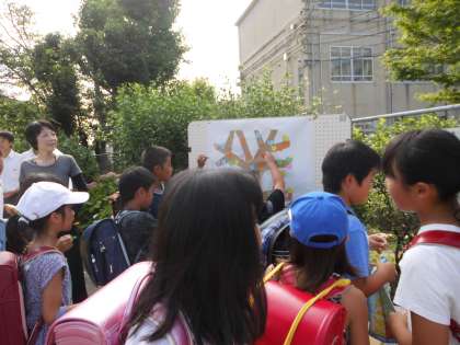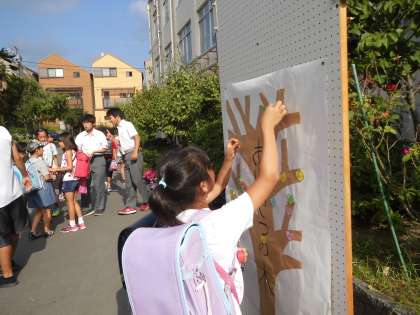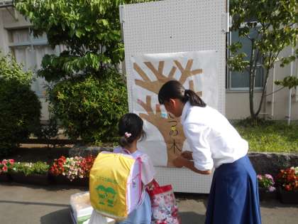 ハート型のシールをもらった人は,あいさつの木のボードにシールを貼っていきます。あいさつの木はあっという間にハートでいっぱいになっていきました。