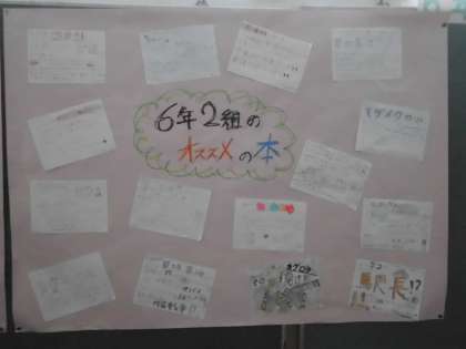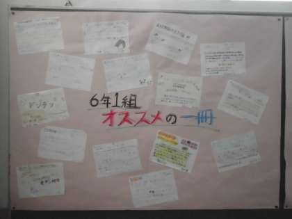 6年生の掲示板に,各自がおすすめする1冊が紹介されています。夏休みはいつもより時間があります。またいろいろな本を手にとって,読書をすすめてほしいです。