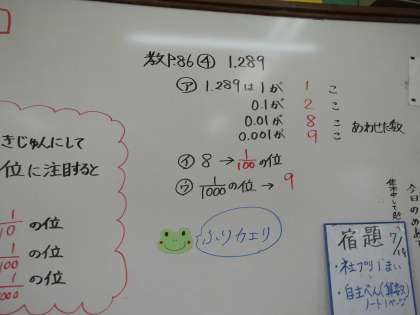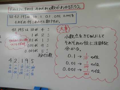 算数の小数の学習を終えた時の黒板です。学習には毎時間めあてがあり,めあてのもと,学習を進めていきます。算数では,学習の最後に,その時間の学習のまとめを「大事」としてまとめています。また,適応題に取り組んで,その時間に学習したことをマスターしていきます。お家でも,子どもたちのノートの様子も見ていただけたらと思います。