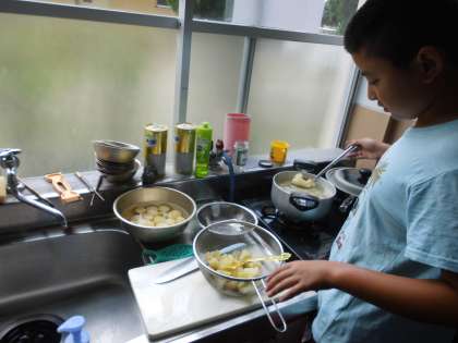 今日は「じゃがバター」に挑戦です。たくさんのじゃがいもの皮をむき,柔らかくなるまでゆでます。最後に味付けして完成です。じゃがいもをゆでる姿は,なかなかのものでした。今回も,職員室に届けてくれましたが,あっという間にみんなでいただきましたよ。「ごちそうさまでした!ありがとう!!」