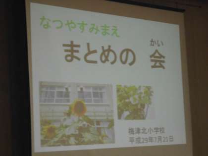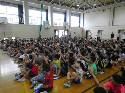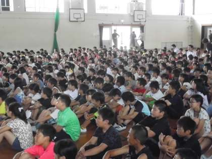 校長先生から,前期前半を振り返ってお話がありました。4月から頑張ってきたことを,写真を見ながらみんなで確認しました。暑い中でしたが,集中してお話を聞く姿に,この4ヶ月の成長を感じました。