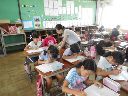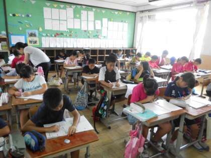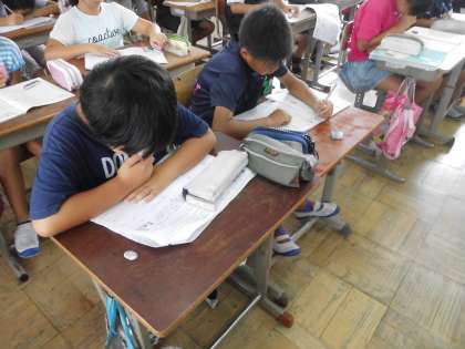 5年生は,2クラスが1つの教室に集まって学習しました。5・6年生は,夏休み明けにジョイントプログラムのテストがあります。夏休みの宿題を1回だけでなく,2〜3回繰り返し取り組むのもいいかもしれませんね。
