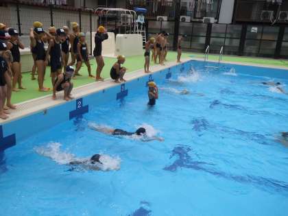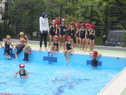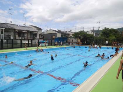 午前中は低学年の水泳学習でした。サマースクール終了後,そのまま参加する人もいて,今日もたくさんの人が集まりました。今日はよく晴れわたり,みんな気持ちよくプールの時間を満喫していました。