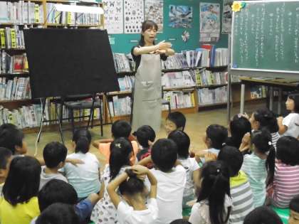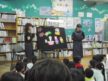 図書ボランティア「ありすのいえ」の方々による『夏のお話会』がありました。毎年恒例となっていますが,今年も絵本の読み聞かせだけでなく,ブラックパネルシアターやミニ手話講座など,たくさんお話を聞かせてもらいました。夏休みは時間があるので,たくさんの本を読んでくださいね。