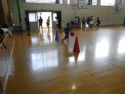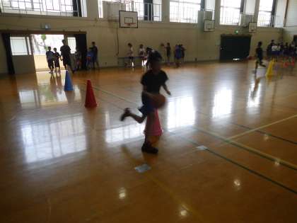 ドリブル練習の様子です。コーンの間をドリブルで抜けていきます。「前を見て!」「ドリブルは低く!」と,一つ一つの動きに細かなアドバイスをもらいながら何本も練習していました。