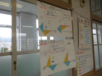 今日も集中して頑張りました。算数では垂直・平行を学習しましたが,三角定規を使ってていねいにかいていました。これまで学習してきたことをしっかり復習できていますね。