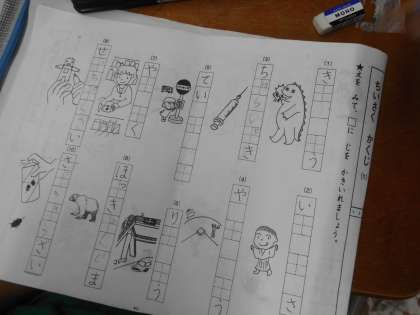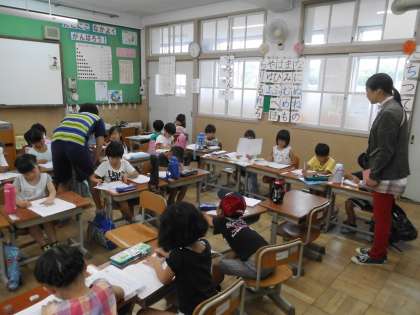 今日も元気にサマースクールにやって来た1年生。先生と一緒に頑張りました。国語で「ちいさくかくじ」を学習しましたが,1年生にとってはまだまだ難しいようで,先生と一緒に確かめながら課題に取り組んでいました。