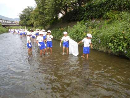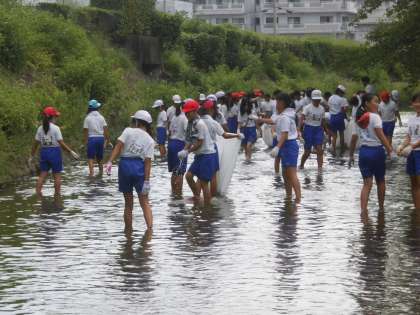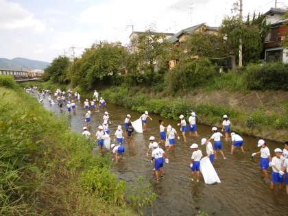 4年生以上は有栖川に入って清掃です。全校のみんなで頑張って清掃して,とてもすっきりしました。これからも気持ちよく学校生活を過ごせるように,日々の掃除も協力してていねいに取り組むようにしたいですね。