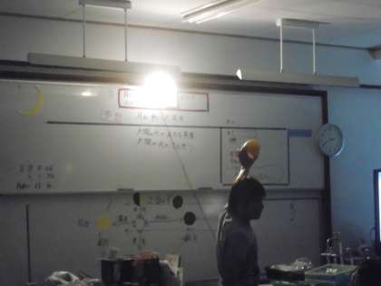 理科で「月と太陽」の学習です。月の満ち欠けの様子を,太陽に見立てた電球の光を手元に持った球に当てながら調べていきました。安全に気をつけながら,夜空に出る月を実際に観察してみるのもいいですね。