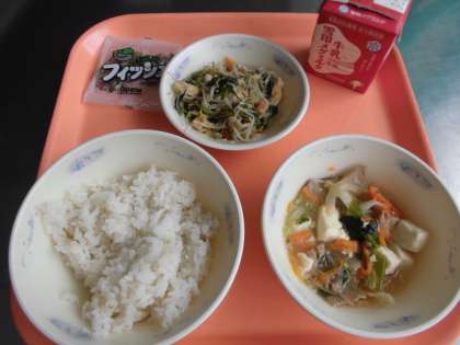 麦ごはん・牛乳・豚肉ととうふのくず煮・もやしの煮びたし・じゃこ