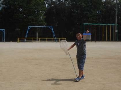この時期,生き物が大好きな人たちは虫捕りに夢中です。網とかごを持って一目散にみどりの広場へ。休み時間の終わりには,バッタやコオロギなどたくさん捕まえてきて,満足気に報告してくれます。そして,帰るときには逃がしてあげるそうです。毎日楽しんでいます。