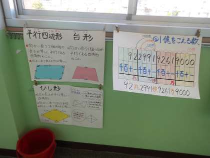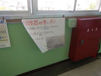 4年生の教室の前の廊下に,算数で学習したことの大事なポイントが掲示されています。学習したことを振り返るとともに,定着させるために掲示しています。