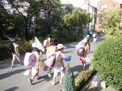 今日もさわやかな朝。みんな元気に登校してきました。1・2年生は今日,構口公園に川遊びに出かけるので,網を持ってきている人もたくさんいました。