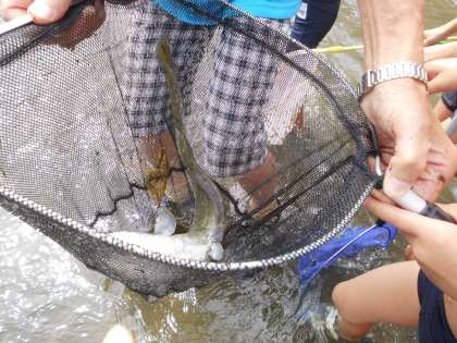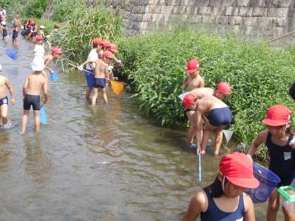 一番みんながびっくりしたのは大きなナマズです。見事に1年生が網で捕まえました。他にも魚やエビ,カメなどたくさん捕まえることができて,みんな大満足でした。