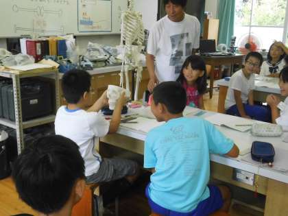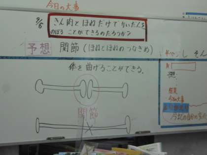 理科「わたしたちの体と運動」の学習です。人間が体を動かすしくみについて学習しました。標本も見ながら骨はどうなっているのかも調べていきました。