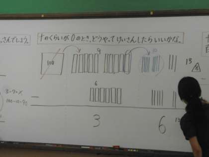 算数で,ひき算の筆算の学習です。「10の位が0の場合」はどのように計算したらいいか考えました。数え棒を使いながら,みんなで考えていきました。今日学習したことは,宿題などで繰り返し練習して,しっかりマスターしていきましょう。