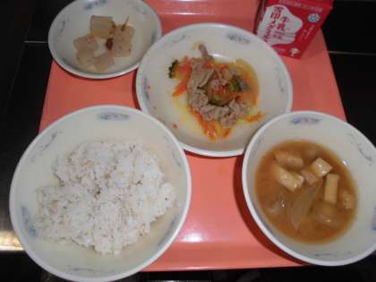 麦ごはん・牛乳・豚肉とゴーヤのしょうがいため・かみなりこんにゃく・いものこ汁