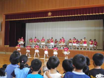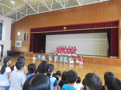 チアリーディング部が,今年度初めての発表です。昼休みに体育館で発表しました。緊張した表情でしたが,笑顔を大事にしてしっかりと発表することができました。次は,10日(日)の敬老福祉ふれあいまつりでの発表です。自信をもって頑張ってください。