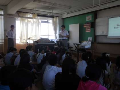 携帯電話会社の方をゲストティーチャーにお招きして,情報モラルの学習です。携帯電話やスマートフォンの特徴を知り,よりよい使い方にみんなで考えました。