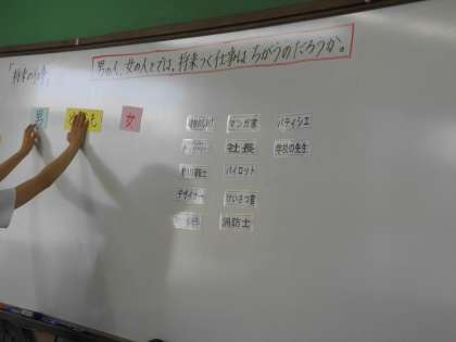 将来の夢をみんなで出し合い,話し合いました。「男の人だから」「女の人だから」ということにとらわれず,みんな自分のしたい仕事に就いたらいいことがわかりました。