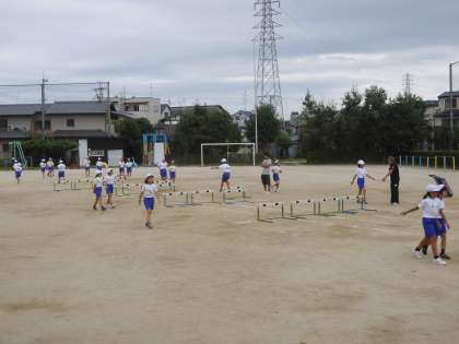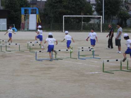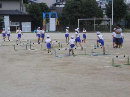 運動会に向けてハードル走をしました。4年生にとっては初めてのハードル走でしたが,繰り返し走っていくうちにコツをつかんでいったようで,上手に走る人もたくさんいました。ポイントは「低くまたぎこすこと」です。友だちに自分の走りを見てもらったり競争したりしながら,うまく走れるように頑張りたいですね。