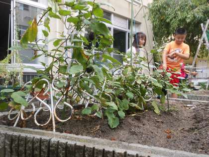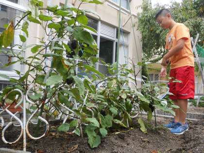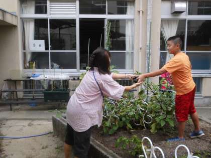 夏野菜の収穫がもう終わりかと思いきや,ナスがまた大きく実をつけています。日々のお世話の賜物ですね。今日は収穫し,また後日調理実習に取り組む予定です。