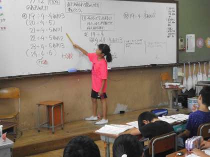 算数であまりのあるわり算を学習しています。これまで割り切れるわり算ばかりだったので,あまりがあるとまた一段と難しくなります。でも,みんなで考えたことを発表し合いながら,一つずつマスターしていこうと頑張っています。