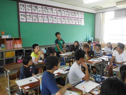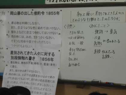 社会の歴史学習です。財政難の時代,江戸幕府の岡山藩が出した倹約令やお触れについて,当時の社会背景を思い浮かべながら,みんなで考えました。
