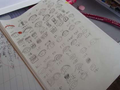 と,昨日のパンに引き続き聞かれ,女の子のノートを覗いてみると,寿司ネタがびっしり。今度は寿司のラインナップを描いています。ちなみに「何が好き?」と聞くと,